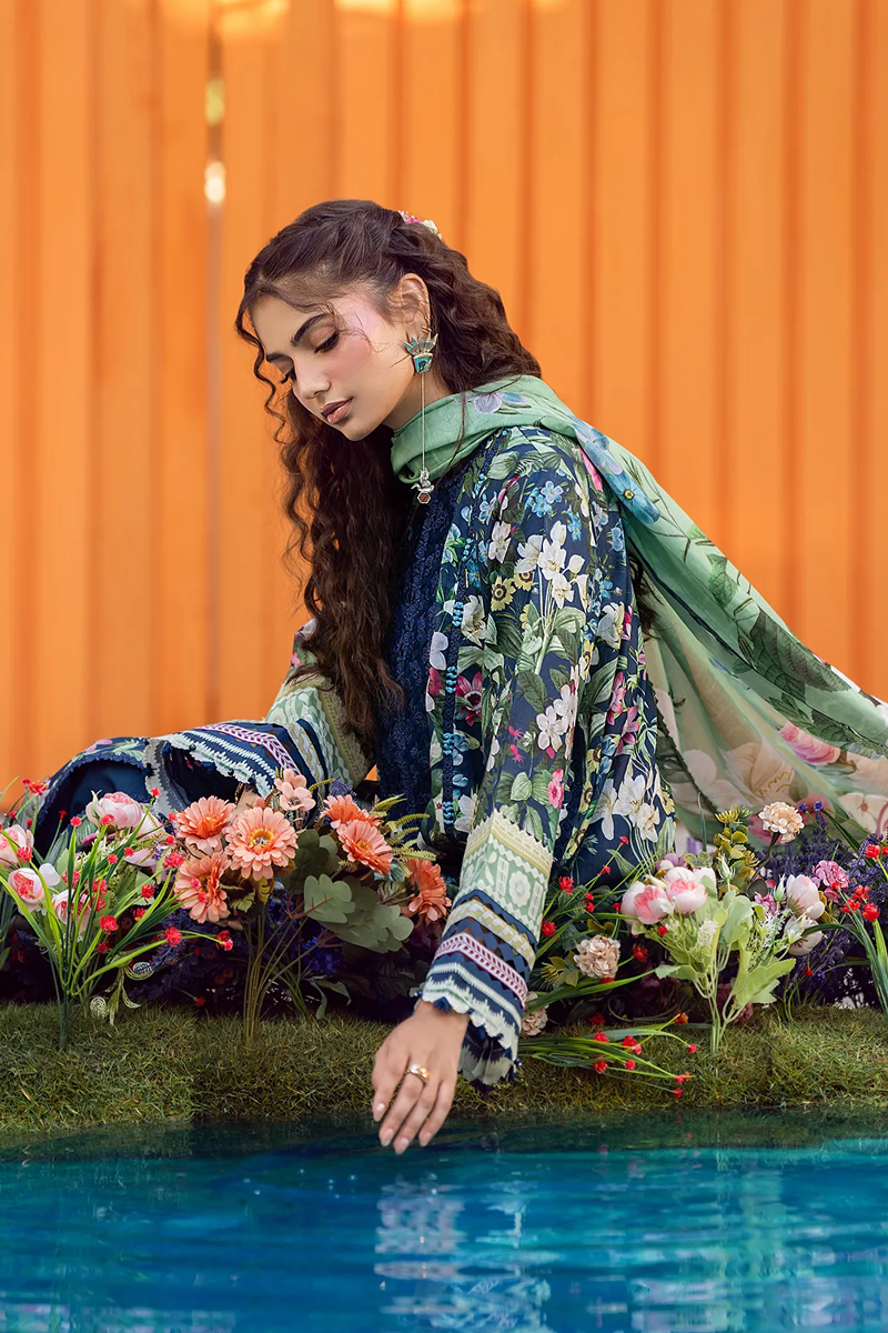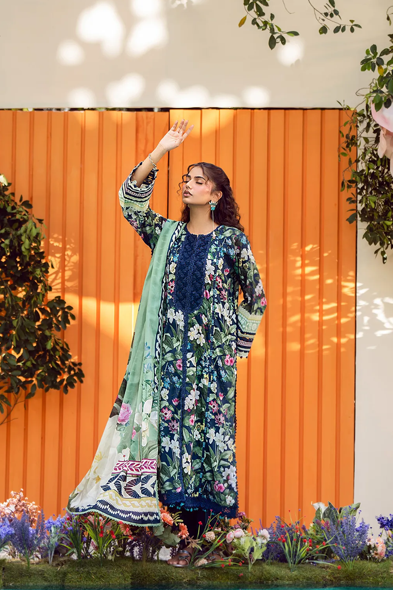 Meadow Muse is a 3-piece unstitched luxury lawn suit featuring a deep blue base with floral prints. It includes