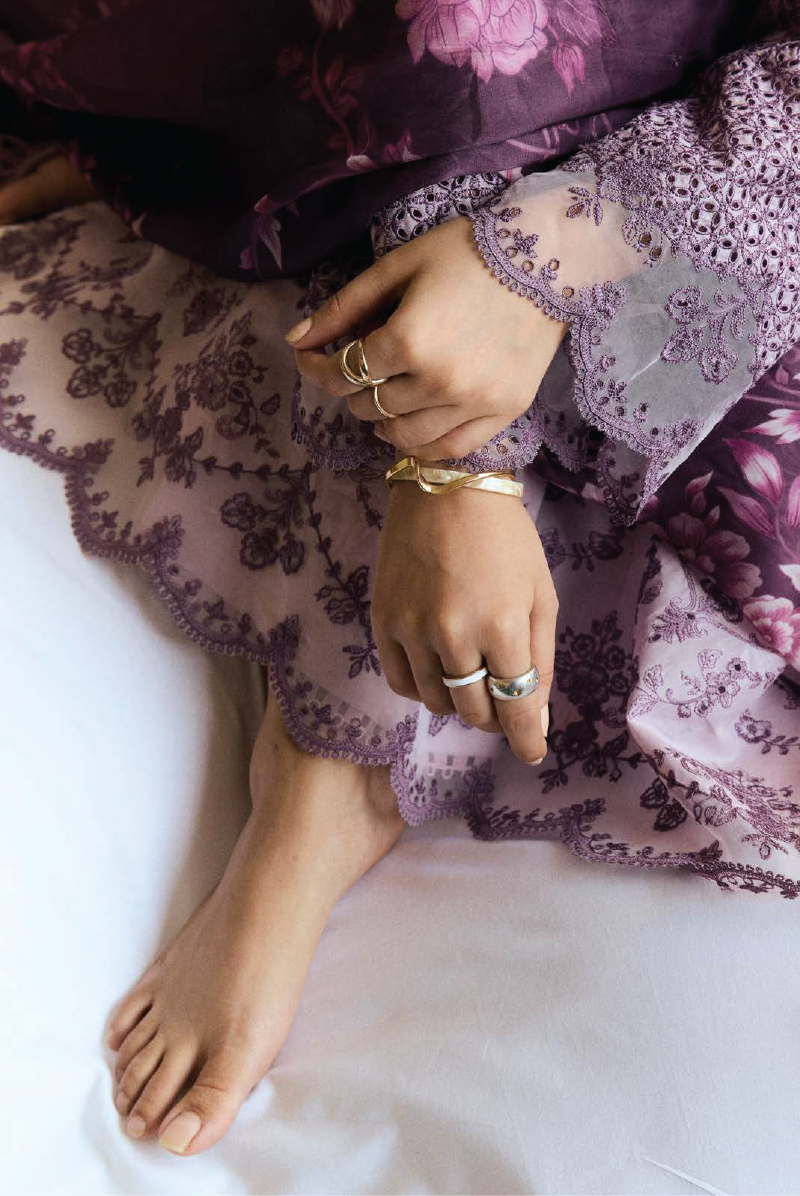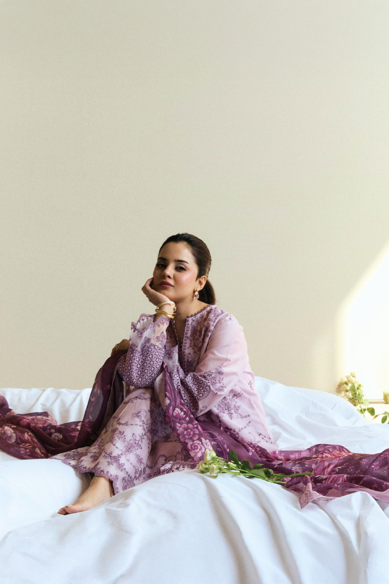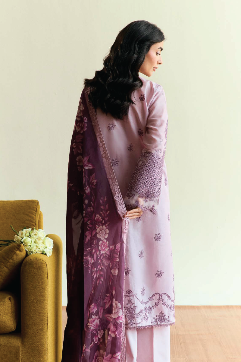 A graceful mauve lawn set layered with tonal embroidery and finished