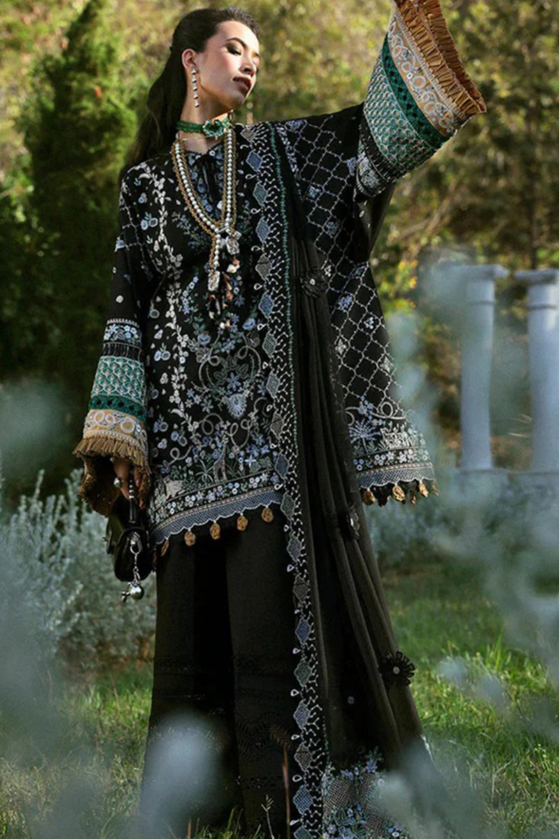 For those who appreciate bold yet graceful attire, ‘Talia’ is the perfect choice for Eid celebrations. The striking black shirt, adorned with intricate embroidery and delicate craftsmanship, exudes effortless elegance. The fully embroidered front panel, enhanced with artistic detailing, adds a touch of grandeur, while the prominently embroidered sleeves, crafted from luxurious satin fabric, elevate the ensemble with a refined, polished look. Draped in a luxurious flowing chiffon dupatta, featuring exquisite embroidery and graceful drapery, this outfit creates a captivating silhouette. Whether you’re attending an intimate dinner or a grand festive gathering, ‘Talia’ makes a bold yet sophisticated statement, perfect for Eid evenings filled with charm and celebration.